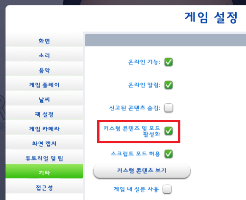 커스텀 콘텐츠 및 모드 활성화가