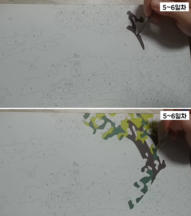 피포 페인팅도 보석 십자수와 마찬가지로 도안이 그려져 있으며 그 속에 번호가 적혀 있는데 물감의 색깔 번호와 일치하는 색을 칠하는 겁니다. 어른들의 색칠 놀이로 이미 유명하죠. 피포 페인팅을 할 때 저만의 팁은, 이게 종종 사진에 나온 완성품과 실제 캔버스 도안에 따라 색을 칠한 완성품이 조금씩 다른 것을 확인할 수가 있는데요, 그럴 때마다 판매 완성품 사진과 실제 캔버스 도안에 안내하는 색깔의 차이점을 발견하고 판매 완성품 사진을 따라 칠해주기만 하면 됩니다. 그리고 예를 들어 나무의 색깔이 진한 갈색이었으면 좋겠는데 옅은 갈색 밖에 없다면 색을 직접 섞어 만들어 칠하는 방법도 있습니다.