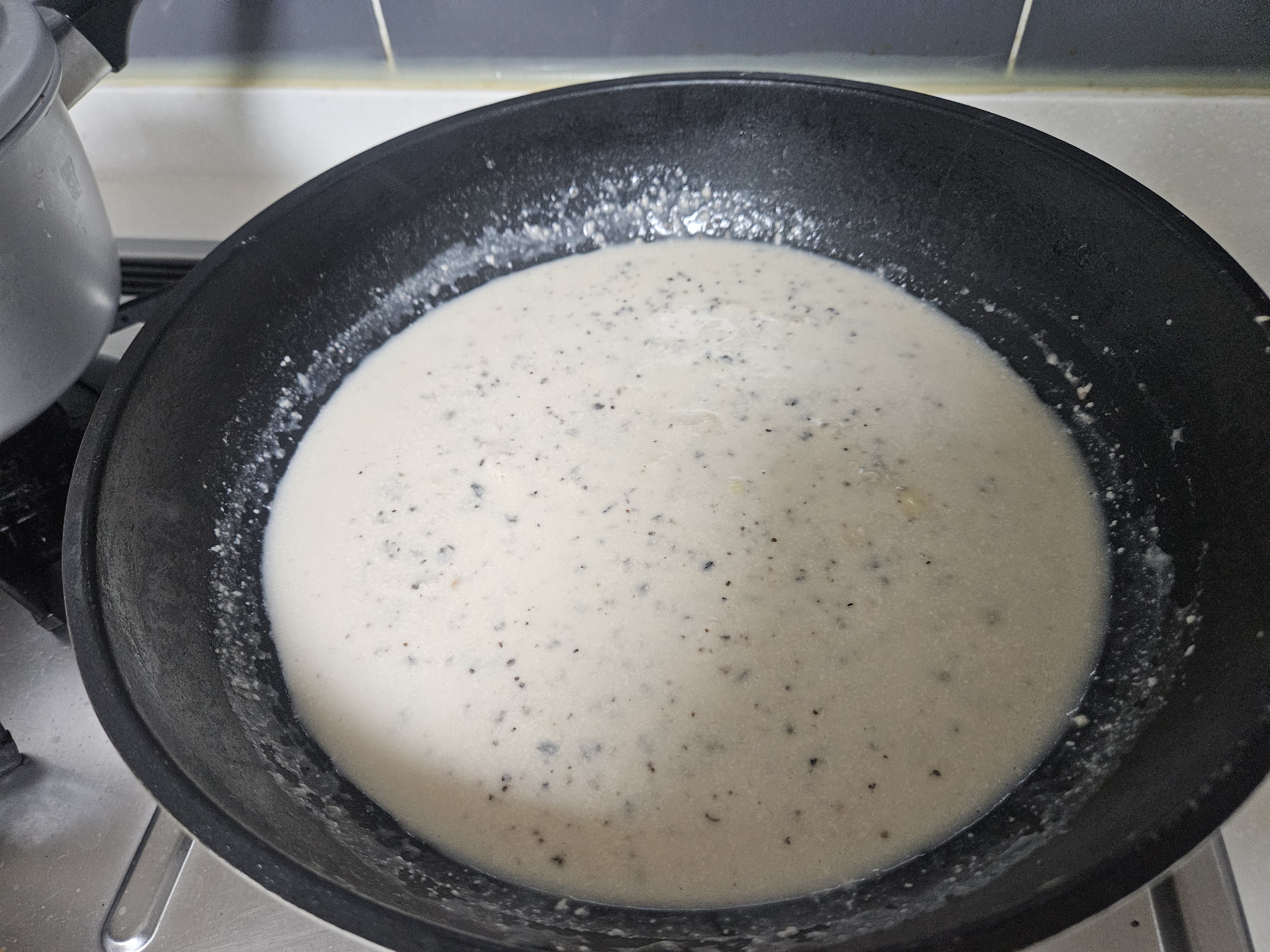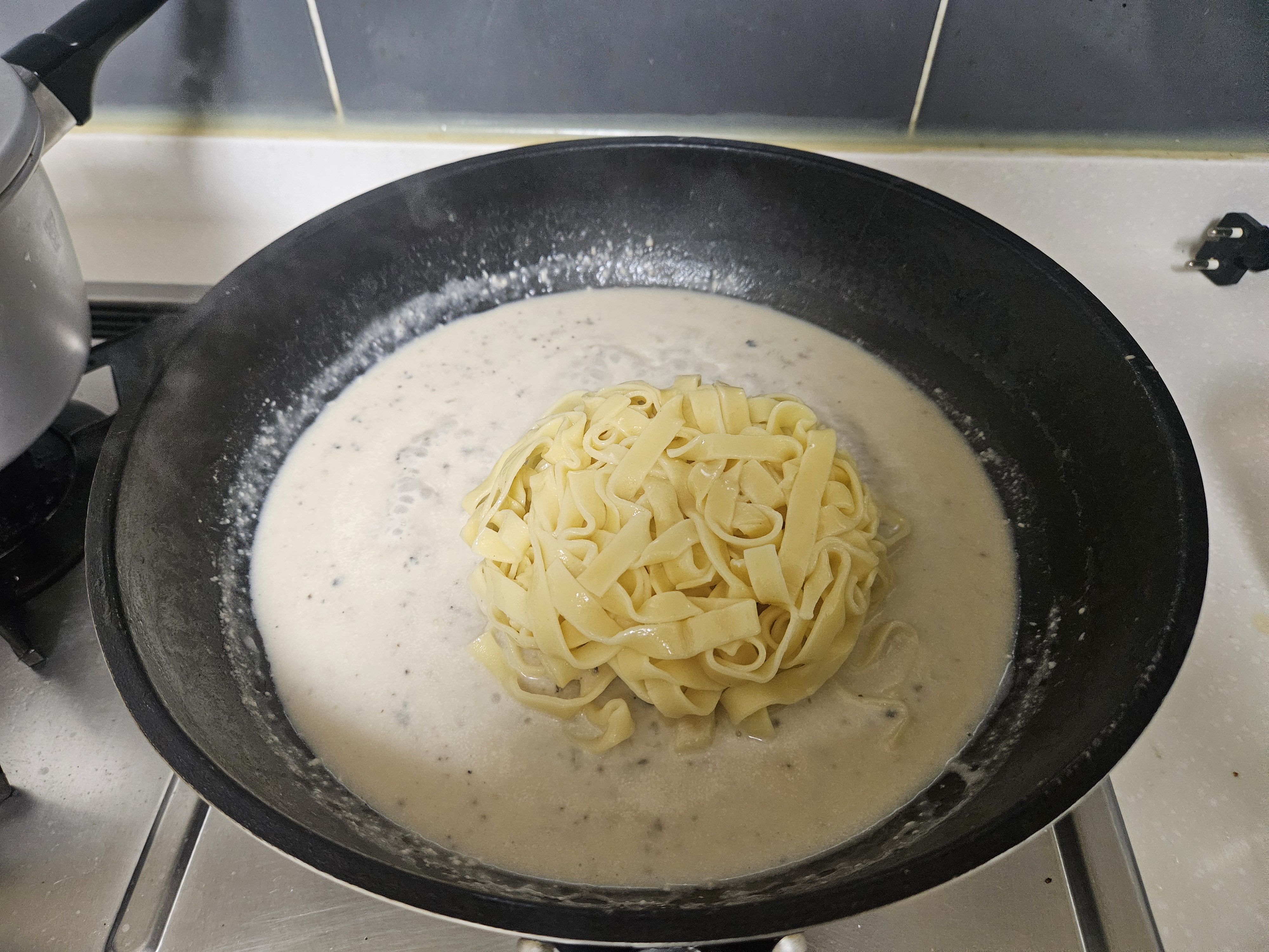 3. 소스가 완전히 녹으면, 삶은 페투치네를 넣고 중불에서 소스가 잘 배도록 조리해줍니다.
