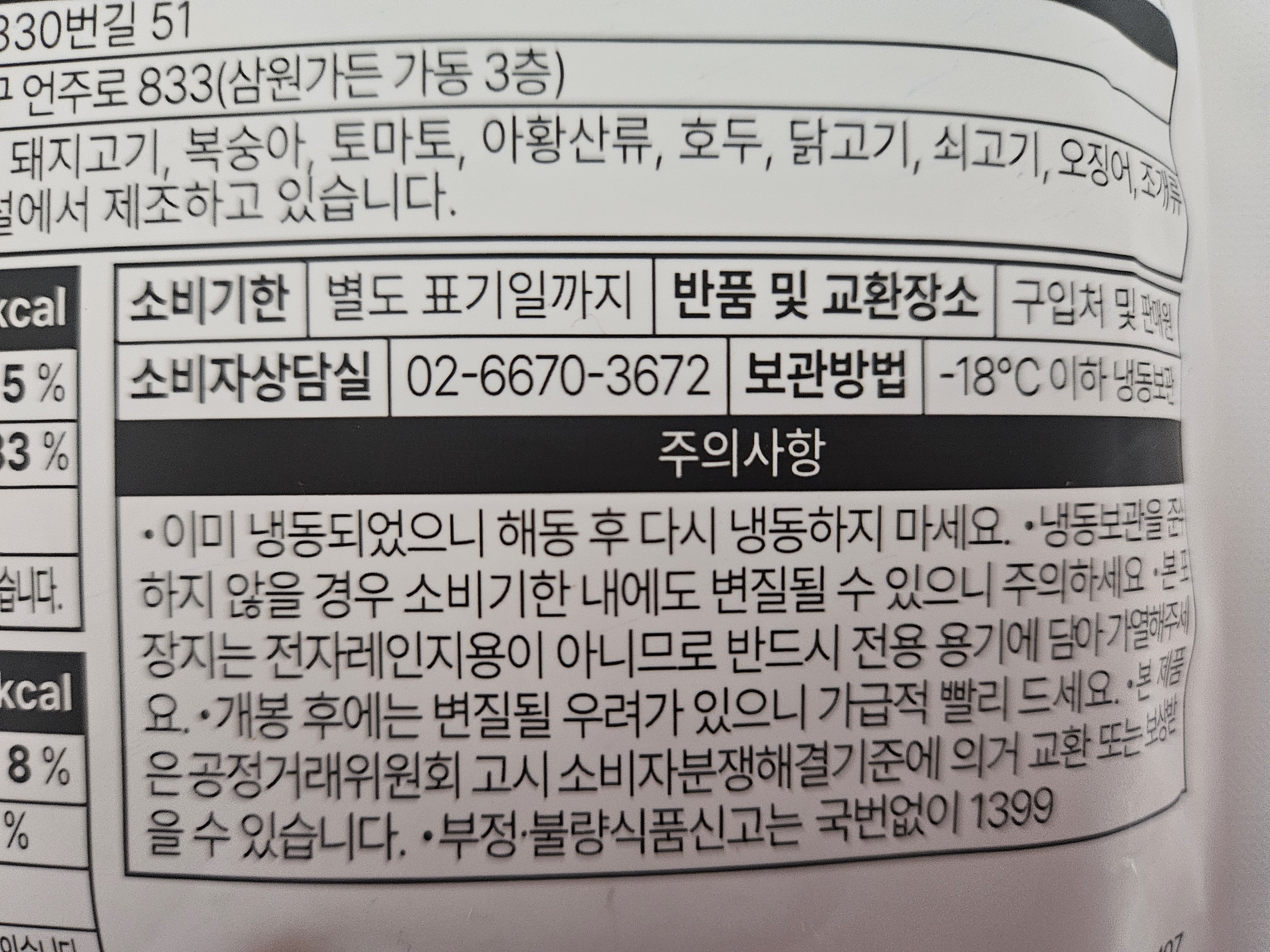 유통기한은 꽤 긴 편이었고, (내년 4월 30일까지) 해동후 재 냉동 금지