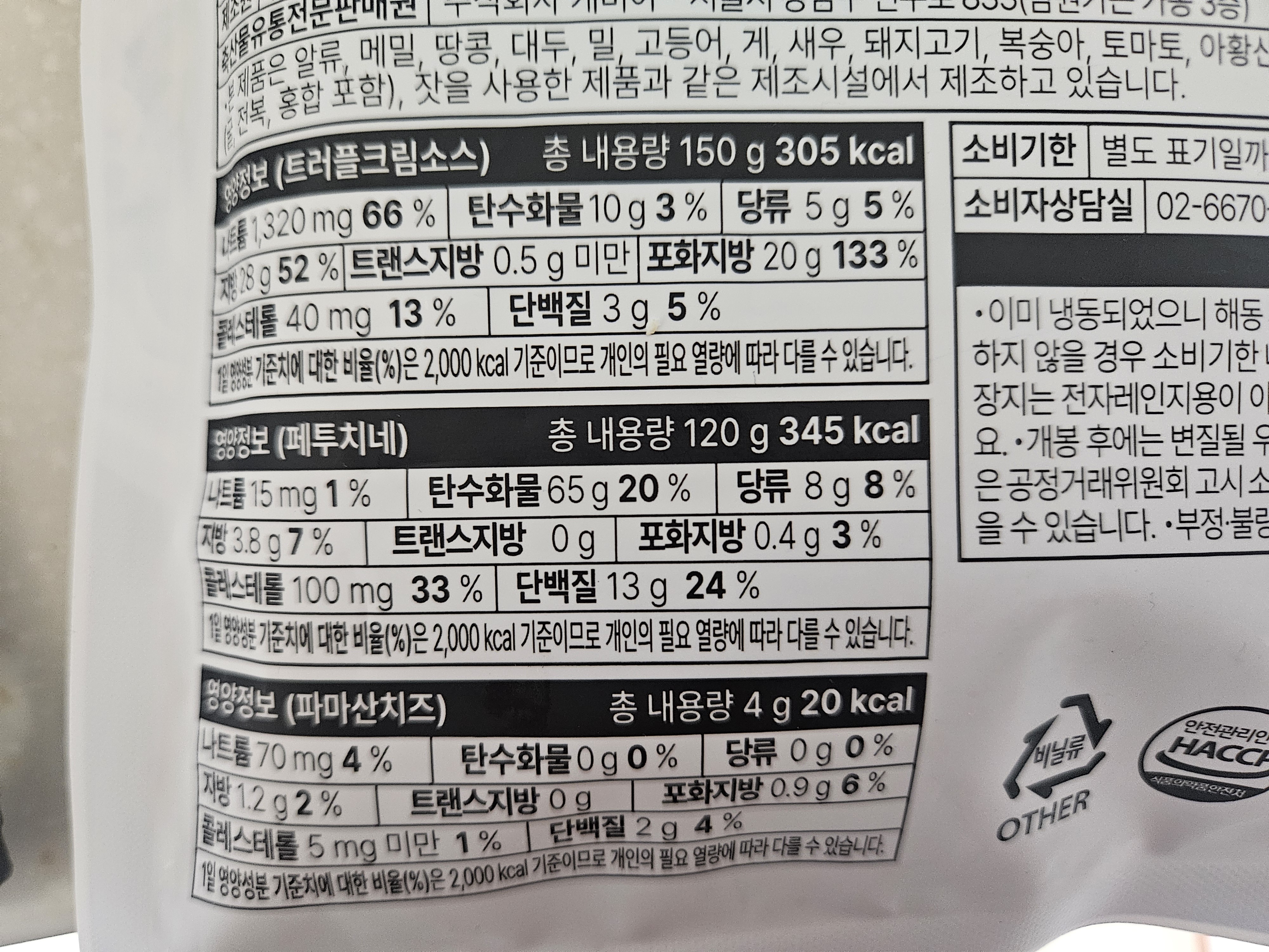 제품에 적혀있는 중량과 칼로리는 크림 소스였습니다.