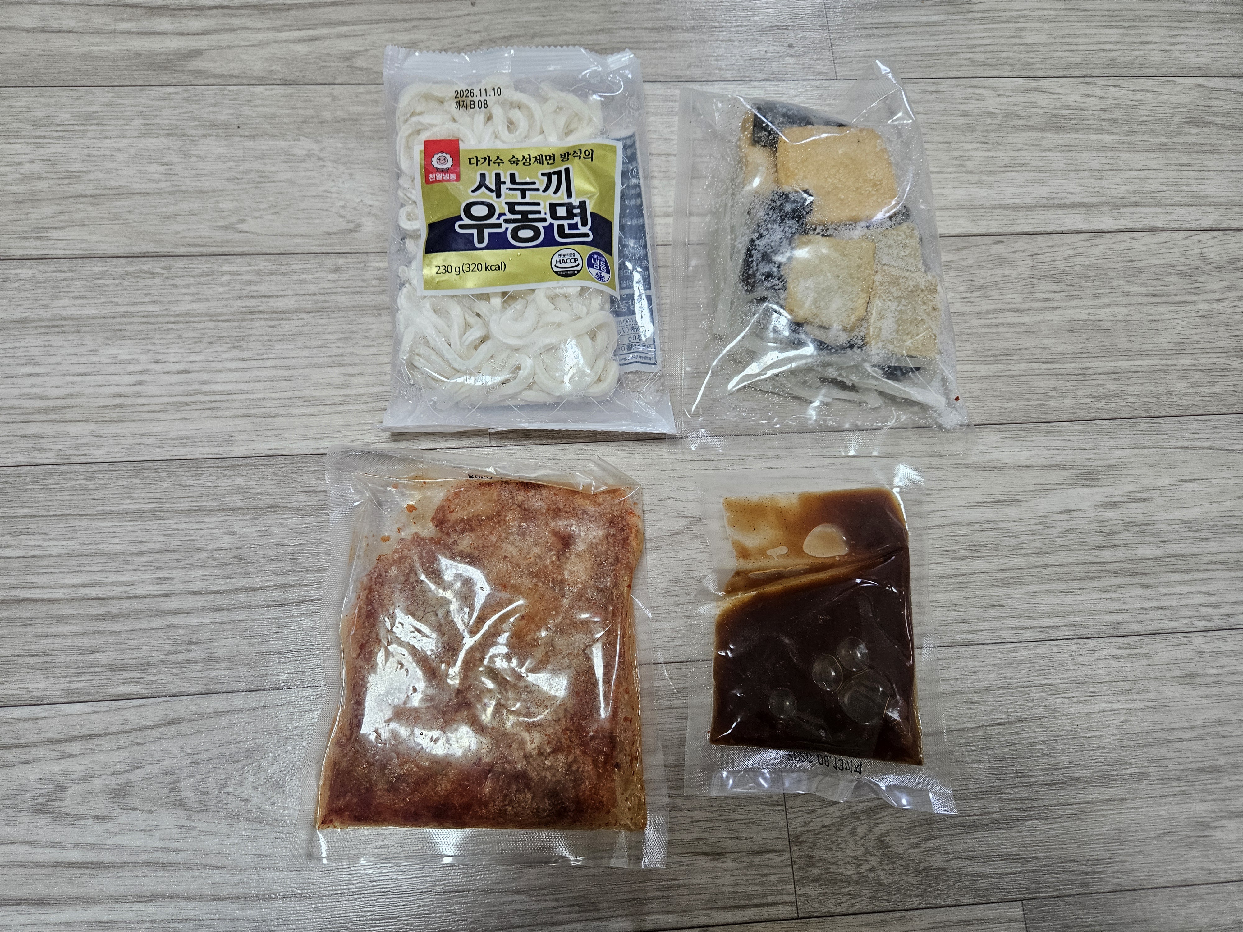 사누끼 우동면과, 김치, 소스, 기타 재료들(유부, 목이버섯, 다시마, 당면)